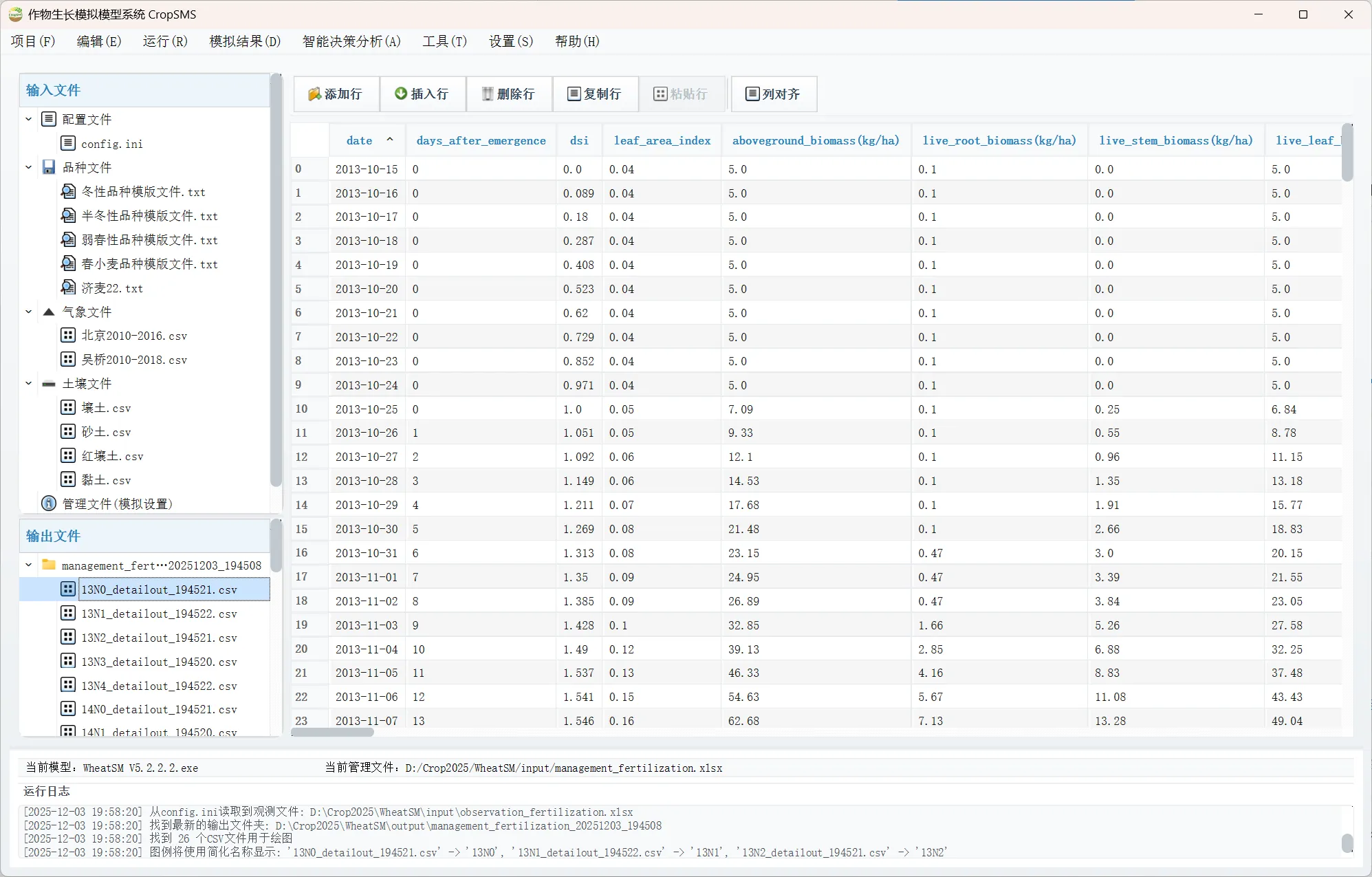 在CropSMS界面,点击【项目】-【选择作物模型】-【选择管理文件】,导入模型数据文件。加载文件后,可在左侧"输入文件"栏目点击文件树,进行相应文件内容浏览或点击打开文件查看、编辑修改或另存文件等,准备好模拟运行文件。